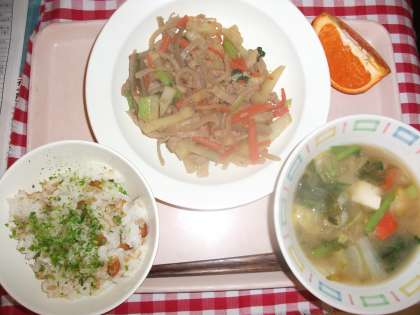 本日の給食は、大豆と青のりのごはん・きんぴら煮・煮干しの味噌汁・くだもの(せとか)・牛乳です。