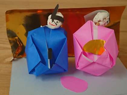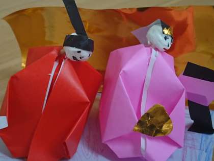左右の写真は数日前に撮影した、1年生が授業で作った雛人形です。小首をかしげていたり、ちょっとわき見をしていたりと、個性的な作品が多くて楽しいです。昨日まで教室前の廊下に飾られていたのですが、今日はなくなっていました。きっと今日持ち帰って、自宅で飾るのでしょう。