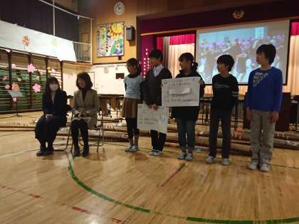 前半は、「○年生グループ」と分けられた6年生の児童たちが、当時の担任やお世話になった教職員を前に、劇やクイズ、お客様へのインタビューなど趣向を凝らした発表をしながら、みんなと思い出を振り返りました。