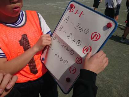 今日はサッカーの試合で、2つのゲームコートに分かれてきびきびと動いていました。審判や記録も児童が交代でしています。