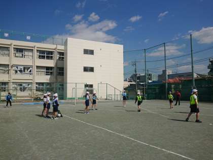 午前11時頃、校庭を見ると、5年生が2クラス合同で体育の授業をしていました。