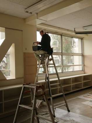 学校では主事さんたちにより、夏休みから体育館の壁面をはじめとした改装、ペンキ塗りなどが行われています。