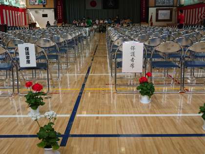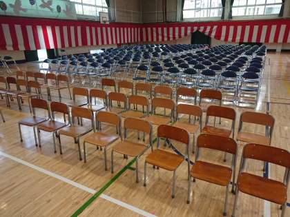 今日は入学式の前日準備があり、午前中には新6年生や新2年生も登校し、練習に取り組んでいました。体育館の中はすっかり入学式の会場になっています。
