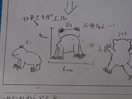 教室の後ろには生きたかえるが水槽の中にいました。なんでも学校の池で見つけたのだそうです。