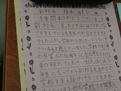 6年生の教室では、来週に行われる離任式に向けて、お客様へのお手紙を書いていました。