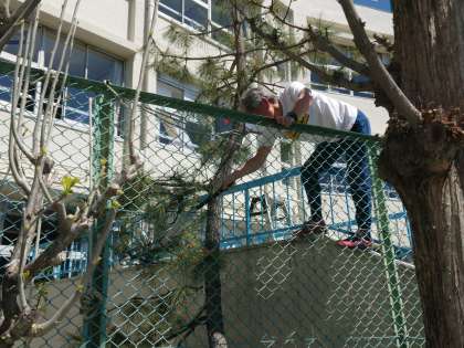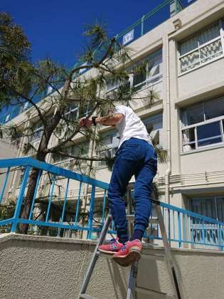 そのとき、ふと校舎脇を見ると、大きな脚立があり、何やら作業をしている人がいました。