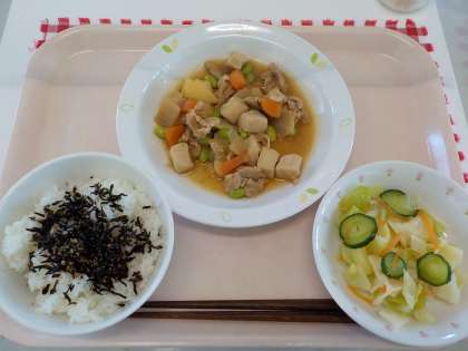 本日の給食は、ごはん・ひじきのふりかけ・肉じゃがうま煮・野菜の甘酢かけです。