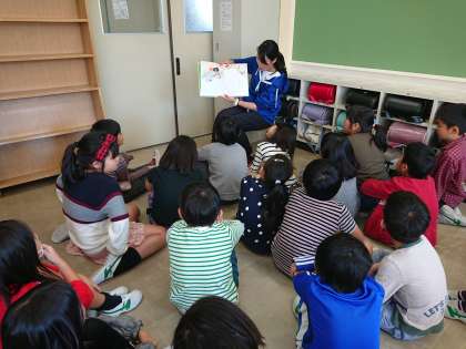 子どもたちを教室の後ろの角に集めての読み聞かせです。これなら絵本の挿し絵もよく見えます。