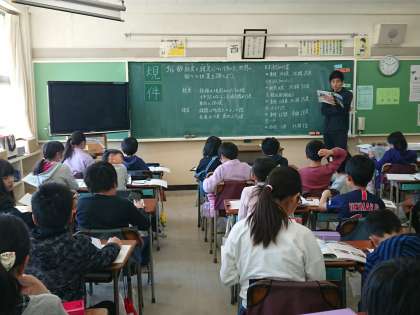 3年生の教室では、国語の授業をしていました。教科書の教材「ききみみずきん」の導入でしょうか、担任が絵本を使って読み聞かせをしていました。