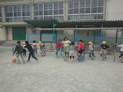 鉄棒の近くでは、黄色い帽子をかぶった1年生が、一輪車の練習をしていました。