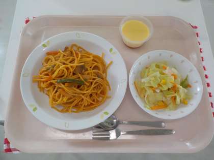 本日の給食は、スパゲッティナポリタン・コールスロー・手作りプリン・牛乳です。