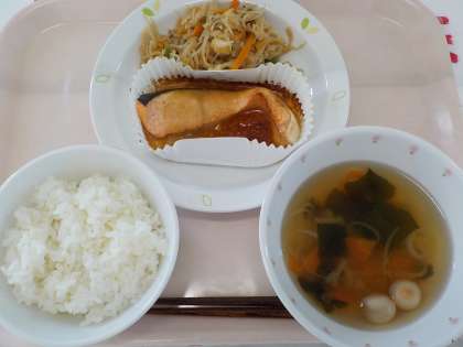 本日の給食は、ごはん・魚のみそマヨネーズ焼き・切干大根の煮付け・小町麩のすまし汁・牛乳です。