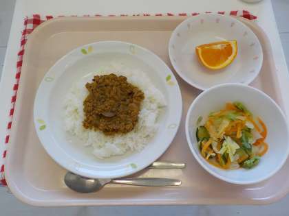 本日の給食は、ドライカレーライス・フレンチサラダ・くだもの(清見オレンジ)・牛乳です。