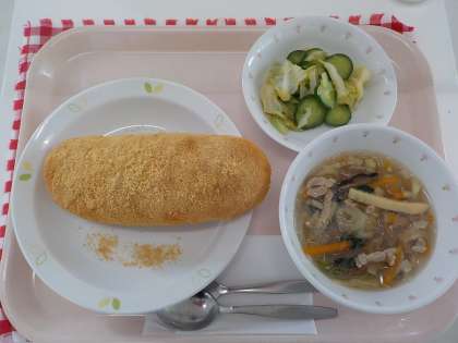 本日の給食は、きなこあげパン・春雨スープ・中華サラダ・牛乳です。