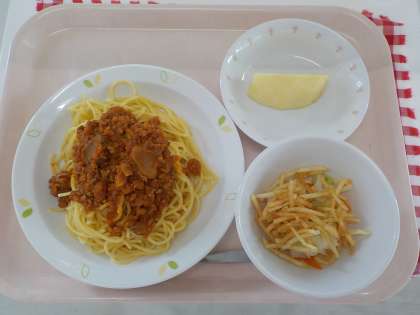 本日の給食は、スパゲッティミートソース・じゃがいものハニーサラダ・りんご・牛乳です。