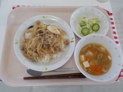 本日の給食は、豚丼・みそ汁・ひとしお野菜・牛乳です。