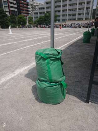 ひとつは、すべてのテントの柱に重さ20kgの重しを2個ずつ巻き付けていたことです。強風でテントが飛ばないようにするための対策だそうです。本校にも貸してもらえることになりました。