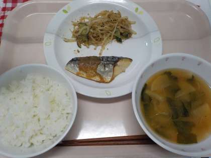本日の給食は、ごはん・さばのピリ辛ソースかけ・ごま酢かけ・みそ汁・牛乳です。