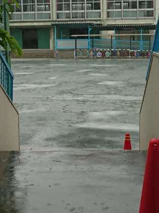 雨の中、扉を開けた体育館からは、音楽や子どもたちのかけ声などが職員室まで聞こえてきます。