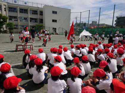 はじめは応援合戦の練習です。赤組、白組に別れ、応援団メンバーのリードでかけ声や手拍子、応援歌などを元気一杯に練習しています。そばに寄るとその声の大きさに圧倒されます。