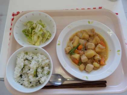 本日の給食は、青菜とじゃこのごはん・じゃがいものそぼろ煮・キャベツのゆかりかけ・牛乳です。