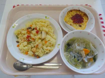 本日の給食は、パエリア・スパニッシュオムレツ・ベーコンと野菜のスープ・牛乳です。