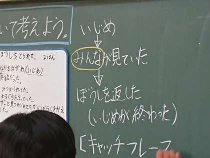 いじめの場面を描いた短い外国の動画を視聴したあと、みんなで意見を出し合っていました。