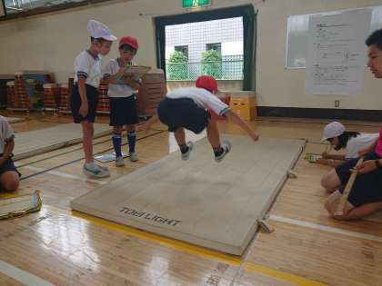 児童は2人一組になって、友達の記録を測ったり数えたりしながらやっていました。