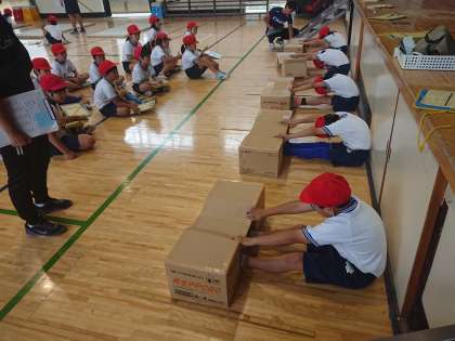 1時間目からは3、4、5年生が体育館に集合し、始めにやり方の説明を聞きました。