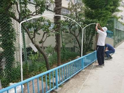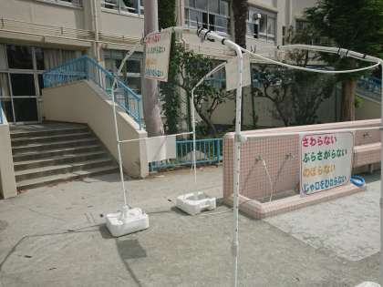注文が多く、運動会には間に合いませんでしたが、やっと暑熱対策のひとつとして、校庭の水飲み場近くにミストシャワーが設置されました。