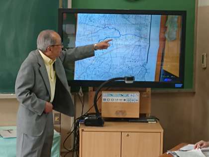 授業のテーマは「緑道の話」。 今の烏山川緑道がどのようにしてできたかを、地図や写真を見せながら分かりやすく説明してもらいました。