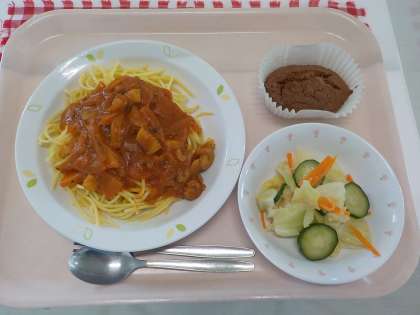 本日の給食は、スパゲッティ地中海ソース・野菜のイタリアンドレッシングかけ・おから入りココアマフィン・牛乳です。