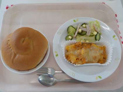 本日の給食は、黒砂糖パン・ポテトグラタン・イタリアンサラダ・牛乳です。