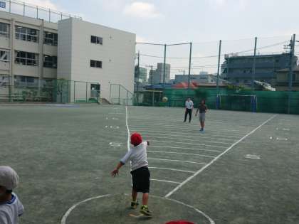 校庭には角度30°の扇形のラインが引かれ、その内側に向かって直径2メートルのサークル内からはみ出さないように気をつけて、できるだけ遠くまでボールを投げます。