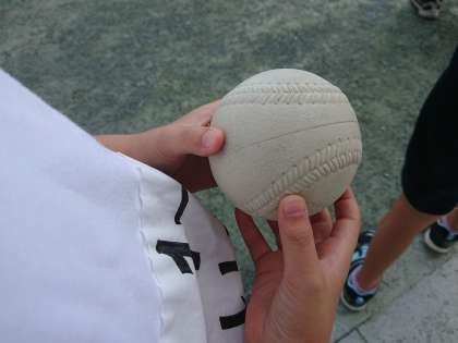 ソフトボールは低学年児童には大きいので、うまくボールが握れないために、遠くまで投げられない子もいます。