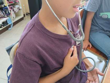 次に心臓の音(拍動)を、聴診器を使って聴きます。思ったよりも大きな拍動を聴き、子どもたちはビックリしているようでした。