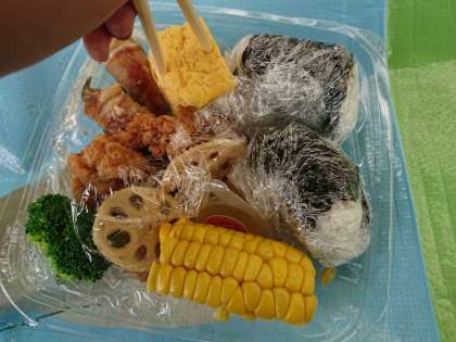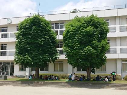 バスはお昼前に学園宿舎に到着し、広い園庭の木陰でお弁当を食べました。日差しは強いのですが雲が多く、富士山は見えません。