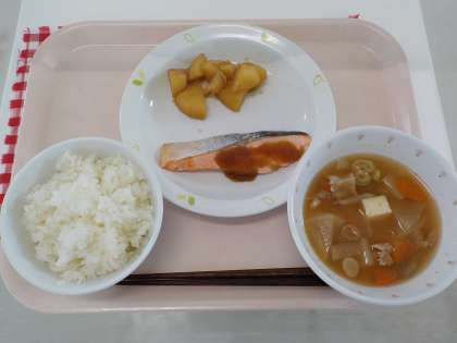 本日の給食は、ごはん・鮭のバーベキューソース・じゃがいもの甘辛煮・豚汁・牛乳です。
