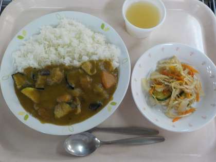 本日の給食は、夏野菜カレー・こんにゃくサラダ・リンゴゼリー・牛乳です。