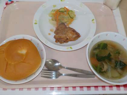 本日の給食は、ミルクパン・照り焼きチキン・りんごドレッシングサラダ・野菜スープ・牛乳です。