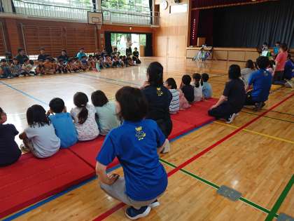 旭小、山崎小、弦巻小、三宿小の4校の子どもたちが体育館に集まり、4校交流会をしています。