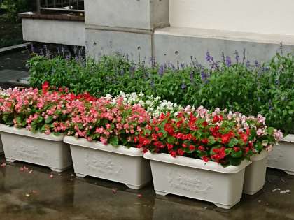 雨降る正門前には、わかば学級の子どもたちがプランターに植えた、オリンピック、パラリンピック関連の花がきれいに咲いています。これらの花は、近日中に業者が取りに来ます。