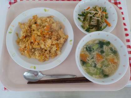 本日の給食は、キムチチャーハン・卵スープ・くきわかめのサラダ・牛乳です。