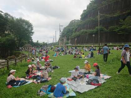 それから歩いて近くの公園へ移動し、お弁当を食べました。多くの学校が次々に集まり、かなりの混雑ぶりです。世田谷区内では、松丘小と祖師谷小の2校と出会いました。