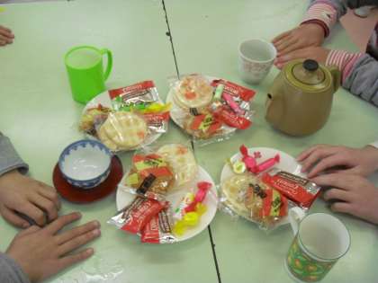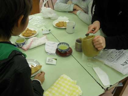 後半は家庭科室でお茶の会をして楽しみました。お茶菓子も分担して持ち寄りました。