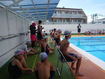 ブールサイドが暑いため、急遽、準備運動は教室で行い、5,6年生は水着に着替えたあと、開始直前まで校舎内で待機させていました。