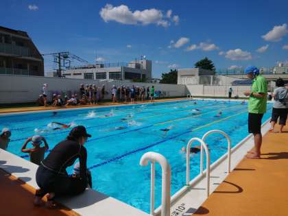 気温が高いので、ブールサイドに水をまいたり、途中で自由にシャワーを浴びたりできるようにして、子どもたちが体調を崩さないように工夫しています。
