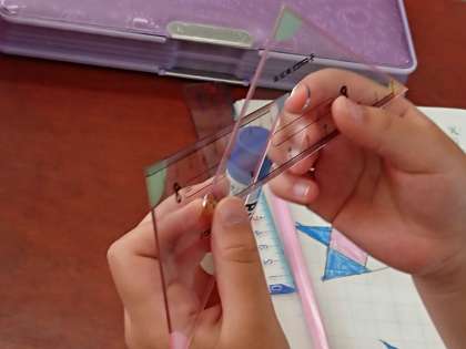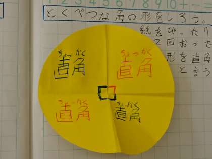 3時間目に2年生の違うクラスの教室を覗くと、算数をやっていました。今日は「直角」という言葉を初めて習い、三角定規を使っての直角の書き方練習です。