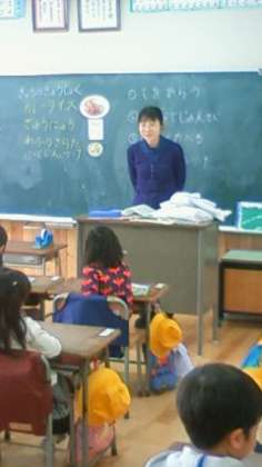 1年生も今日から給食が始まりました。4時間めに、栄養士の先生から給食についてのお話を聞きました。さあ、いよいよ給食の時間です。「おなかすいた。」の声が聞かれました。今日の献立は カレーライス、牛乳、和風サラダ、福神漬けです。「おいしそう!」さあ、初めての給食の感想は?「おいしかった!」