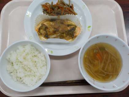 本日の給食は、鮭のちゃんちゃん焼き・ごぼうとこんにゃく炒め・吉野汁・牛乳です。